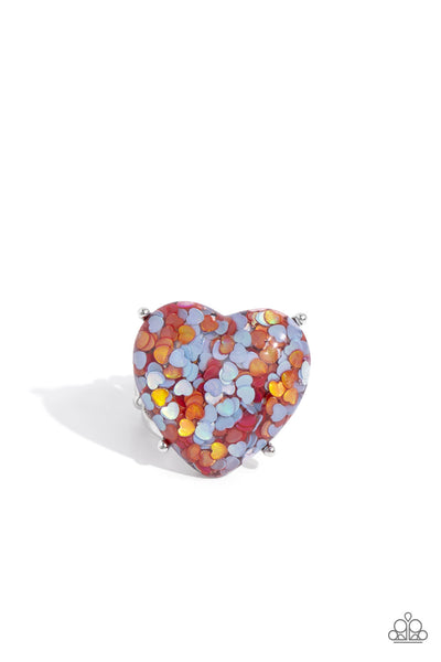 Encased within an exaggerated heart frame, dainty red and blue hearts with flecks of iridescence pattern into a kaleidoscope of color atop the finger on airy bands for a flirty finish. Features a stretchy band for a flexible fit. Due to its prismatic palette, color may vary.