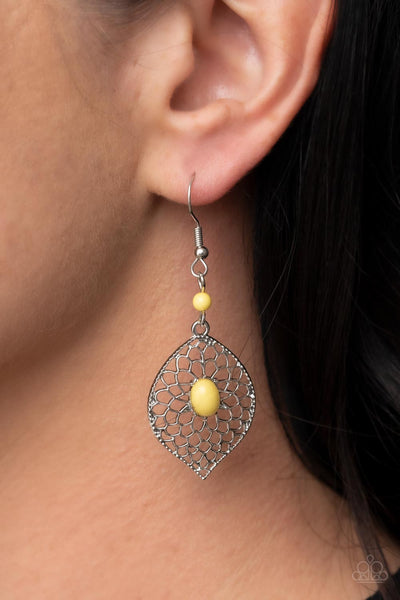 Airy silver petals bloom from an oval yellow beaded center at the bottom of a solitaire yellow bead, resulting in a colorful floral lure. Earring attaches to a standard fishhook fitting.