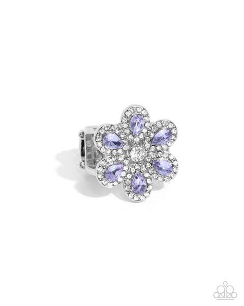 Featured atop a white rhinestone-embellished silver flower, purple gem teardrop petals bloom from a white gem center atop the finger for a radiantly refined look. Features a stretchy band for a flexible fit.
