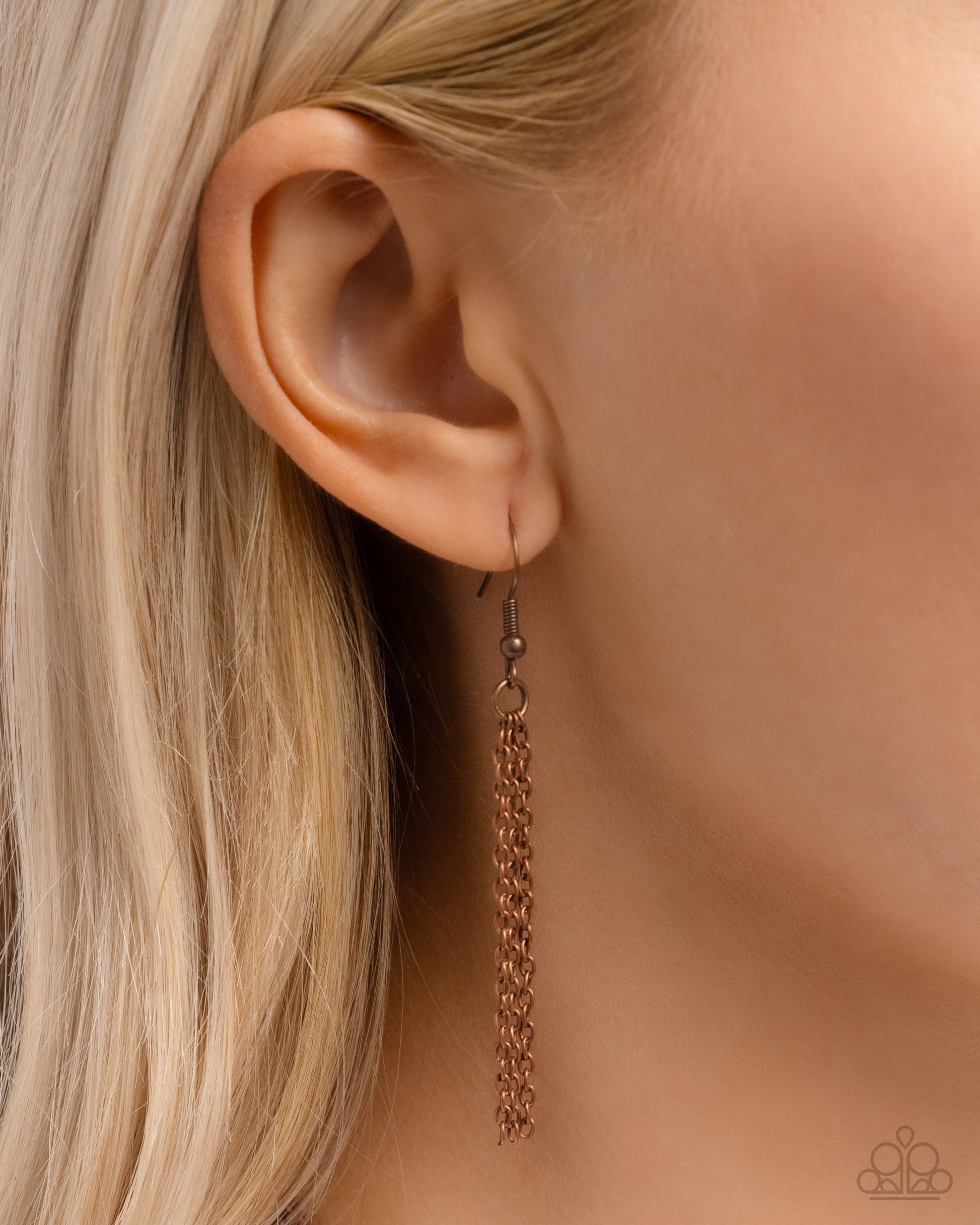 Infused with three colorful pendants, three shimmery copper chains layer across the chest. Pressed in a copper rectangular frame, an opalescent shell swings from the uppermost chain above a white rhinestone-encrusted diamond-shaped frame. A pink-marbled stone hangs from the lowermost chain for a playful vibe. As the stone elements in this piece are natural, some color variation is normal.