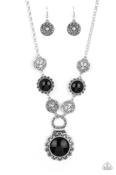 Shiny oversized black beads are wrapped in floral-inspired frames of silver, filled with studded texture. Silver discs embossed in a filigree motif alternate with the vibrant beads as they link along the collar, with a larger version of the black accents dropping below to create a whimsical pendant. Features an adjustable clasp closure.
