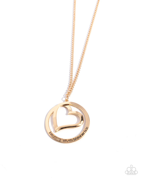 An airy gold circular frame wraps around to enclose a gold heart. The frame is inscribed with the words, "Everything I am, you helped me to be," for a positively lovely pendant swinging from a lengthened gold chain. Features an adjustable clasp closure.