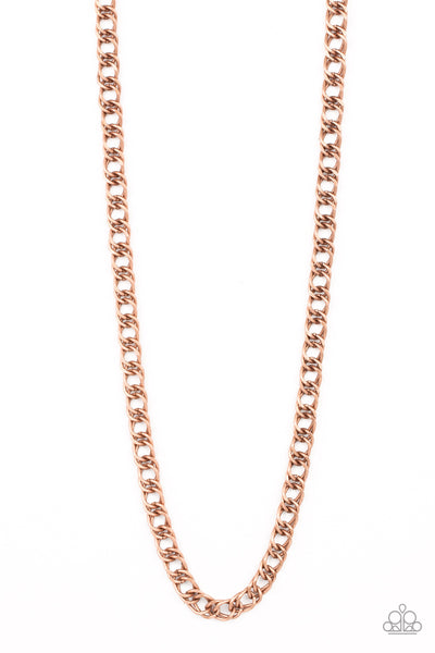 Brushed in a burnished finish, pairs of oversized copper oval links lock in place across the chest for an intense industrial fashion. Features an adjustable clasp closure.