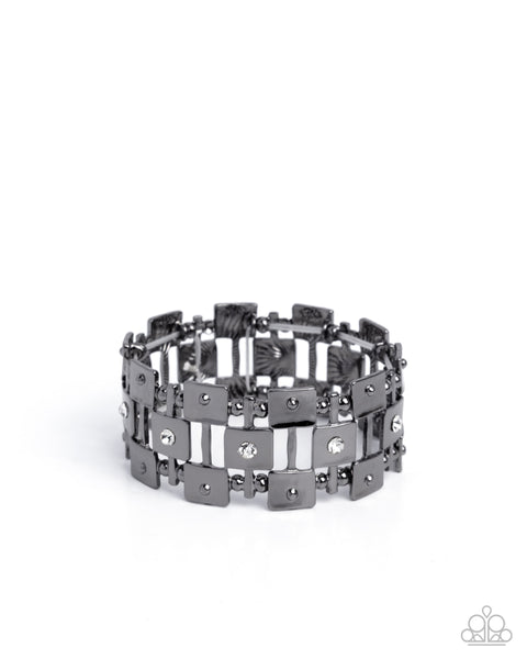Dotted with gunmetal studs and white rhinestones, alternating rows of gunmetal squares stagger across the wrist beside hammered gunmetal bars and gunmetal beads for a gritty-glamorous statement atop the wrist along elastic stretchy bands.