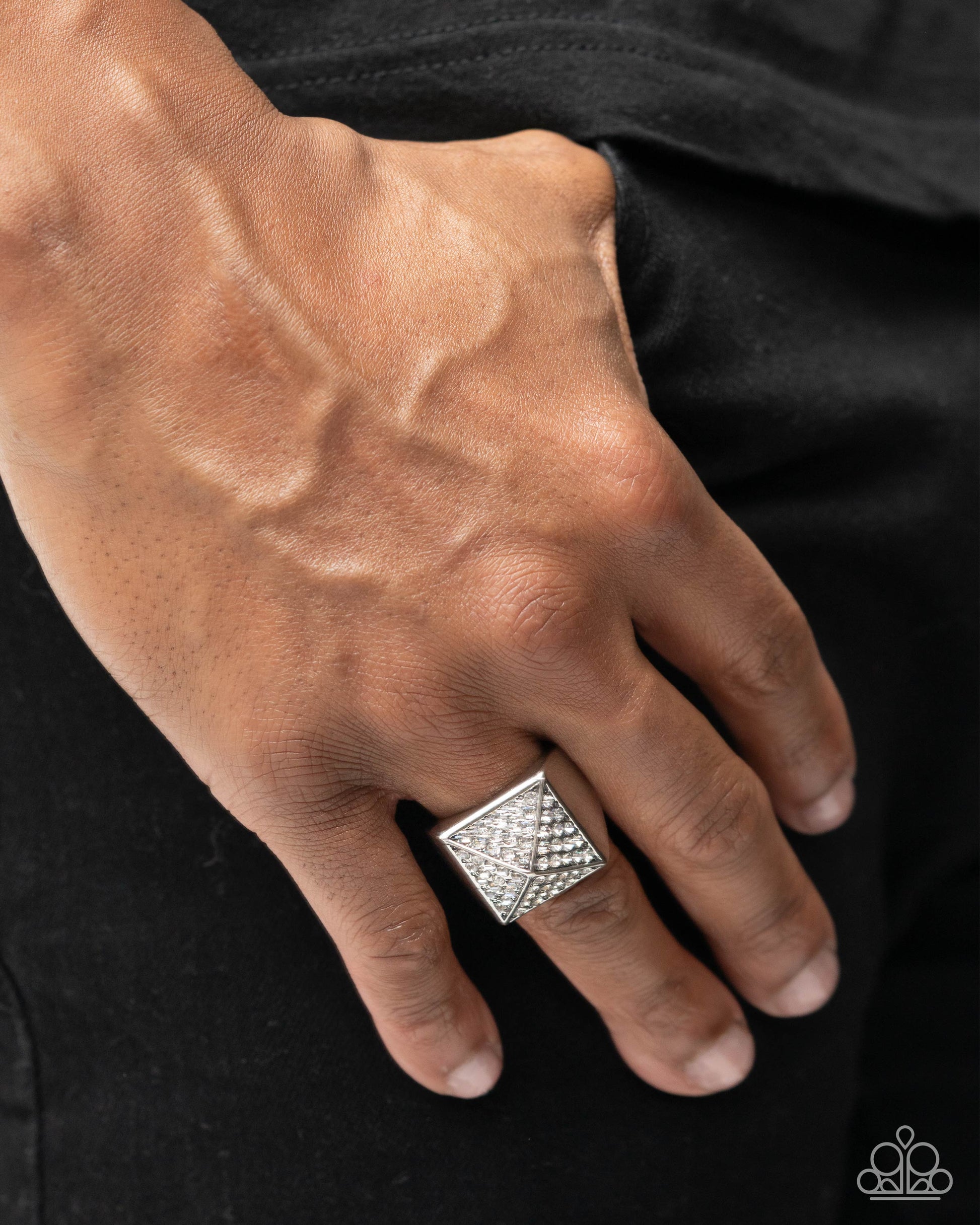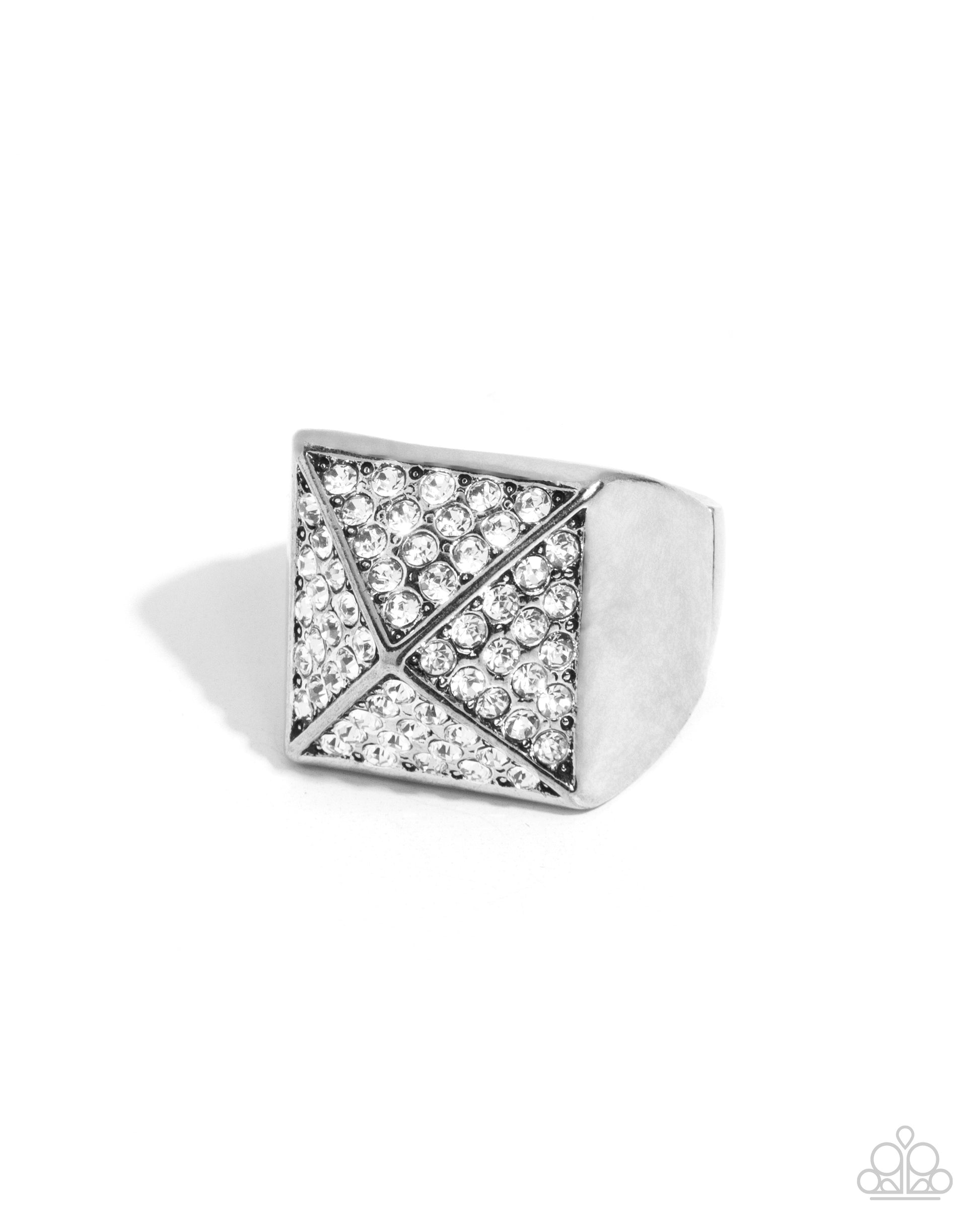 Encrusted in glassy white rhinestones, silver triangular frames build into a pyramidal centerpiece atop a thick silver band for a dauntless look. Features a stretchy band for a flexible fit.