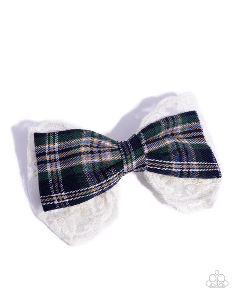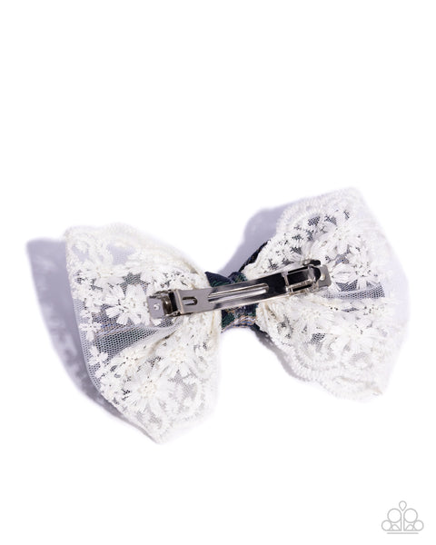 Featuring a layered motif, a blue-patterned plaid ribbon and white lacy ribbon tie together into a chic bow. Features a standard hair clip on the back.
