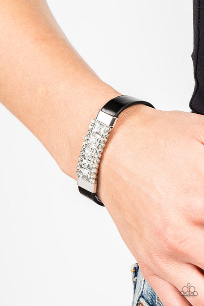 Flanked between two rows of glassy white rhinestones, a section of square cut white rhinestones adorns the center of a silver frame that attaches to a dainty black leather band around the wrist for a sassy sparkle. Features an adjustable snap closure.