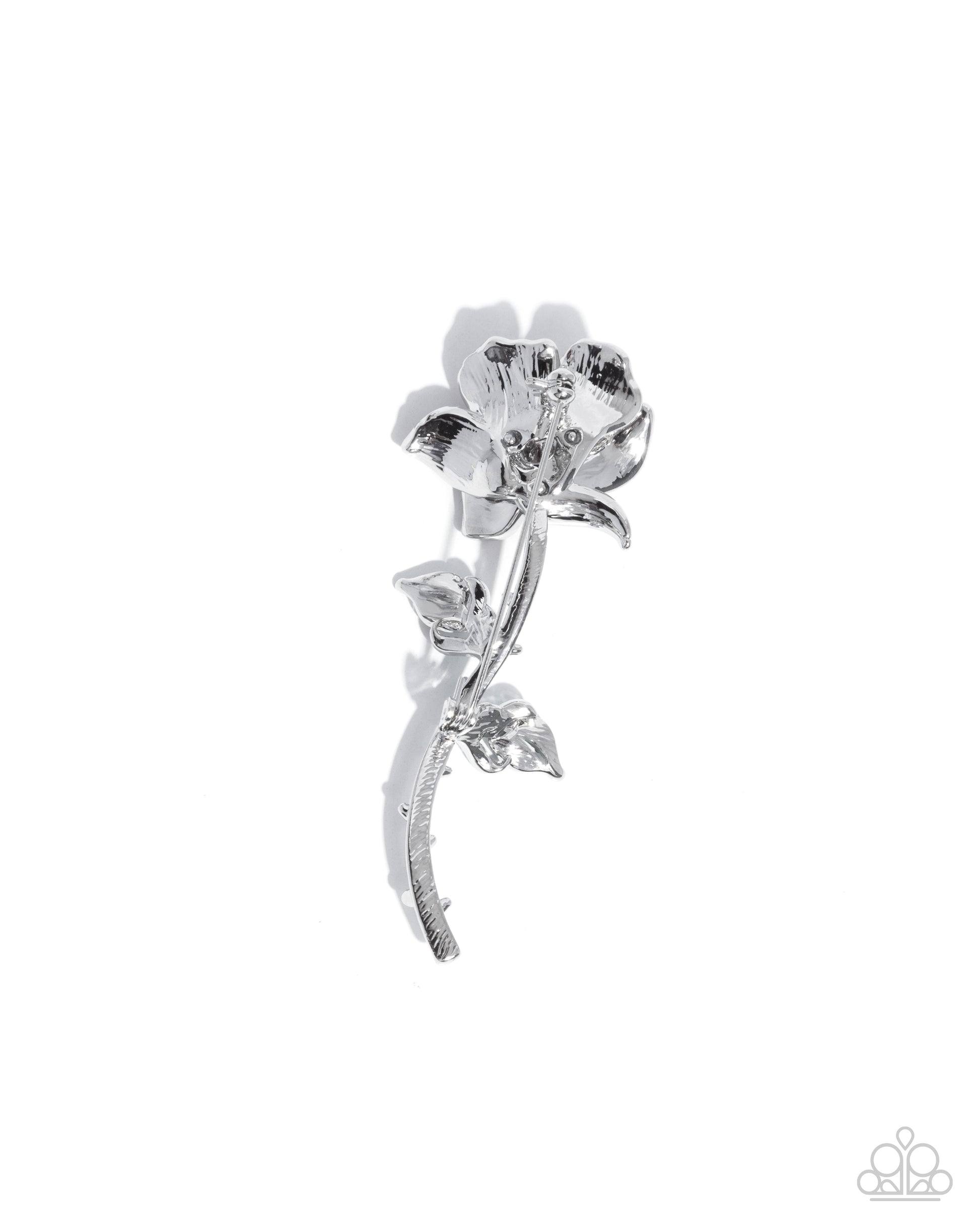Featuring red and Malachite rhinestones, an intricately detailed silver rose complete with textured leaves, thorns, and three-dimensional petals blooms into a breathtaking centerpiece. Brooch measures approximately 1 1/4" in length and 3" in width.