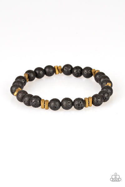 An earthy collection of brassy metallic accents and black lava beads are threaded along a stretchy band around the wrist for a seasonal look.