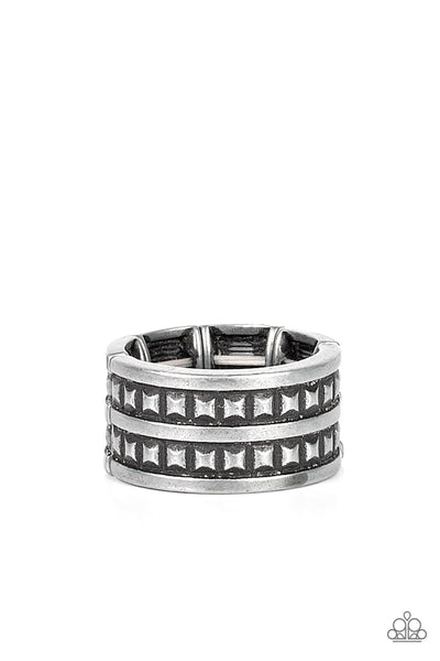 Brushed in an antiqued tin finish, two rows of faceted square studs stack across a silver band for a rustic look. Features a stretchy band for a flexible fit.