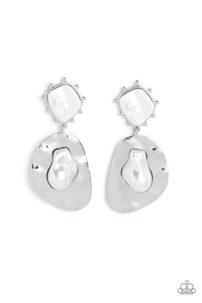 An oversized hammered, asymmetrical silver disc dangles from a more dainty, asymmetrical silver frame, accented with raised silver studs around its edges. Pressed in the center of the studded display, an abstract, white shell with a pearlized finish shines while a baroque pearl gleams for a refined finish inside the oversized display. Earring attaches to a standard post fitting.