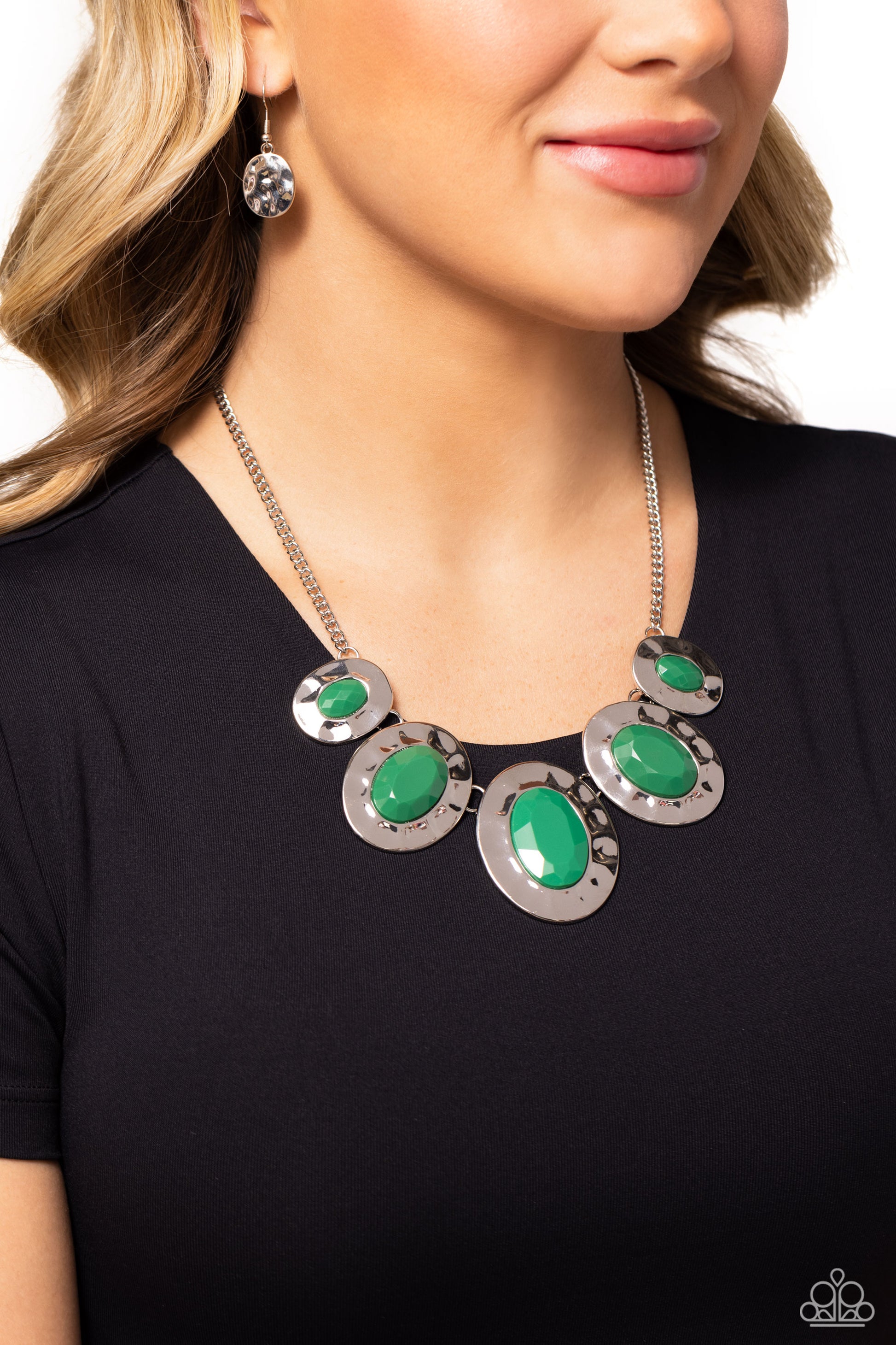 Gradually increasing in size, hammered silver oval frames are dotted with opalescent Leprechaun beads as they delicately link below the collar for a refreshing pop of color. Features an adjustable clasp closure.