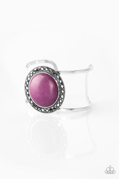 A vivacious purple stone is pressed into the center of a shimmery silver frame radiating with sunburst details. The earthy frame sits atop an airy silver cuff for a seasonal finish.