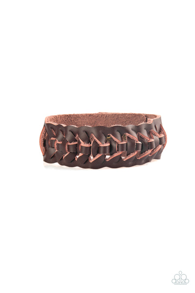 The center of a brown leather band weaves into a rugged braid across the wrist for a rustic look. Features an adjustable snap closure.