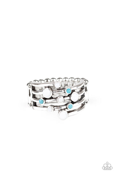 Dotted in faceted Mosaic Blue and white beads, dainty silver bands stack across the finger, creating a whimsically layered frame. Features a stretchy band for a flexible fit.
