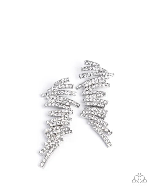 An icy stack of white rhinestone-embellished silver bars in varying sizes stagger and cascade below the ear, coalescing into a shockingly sparkly frame. Earring attaches to a standard post fitting.