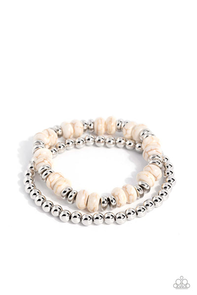 A refreshing assortment of white stone beads, silver accents, and classic silver beads are threaded along stretchy bands around the wrist, creating an earthy pair.