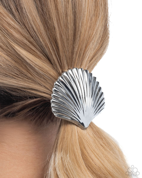 Featuring a textured silver seashell, a sturdy elastic hair tie has the capability to wrap around the hair multiple times for a captivating chic look.