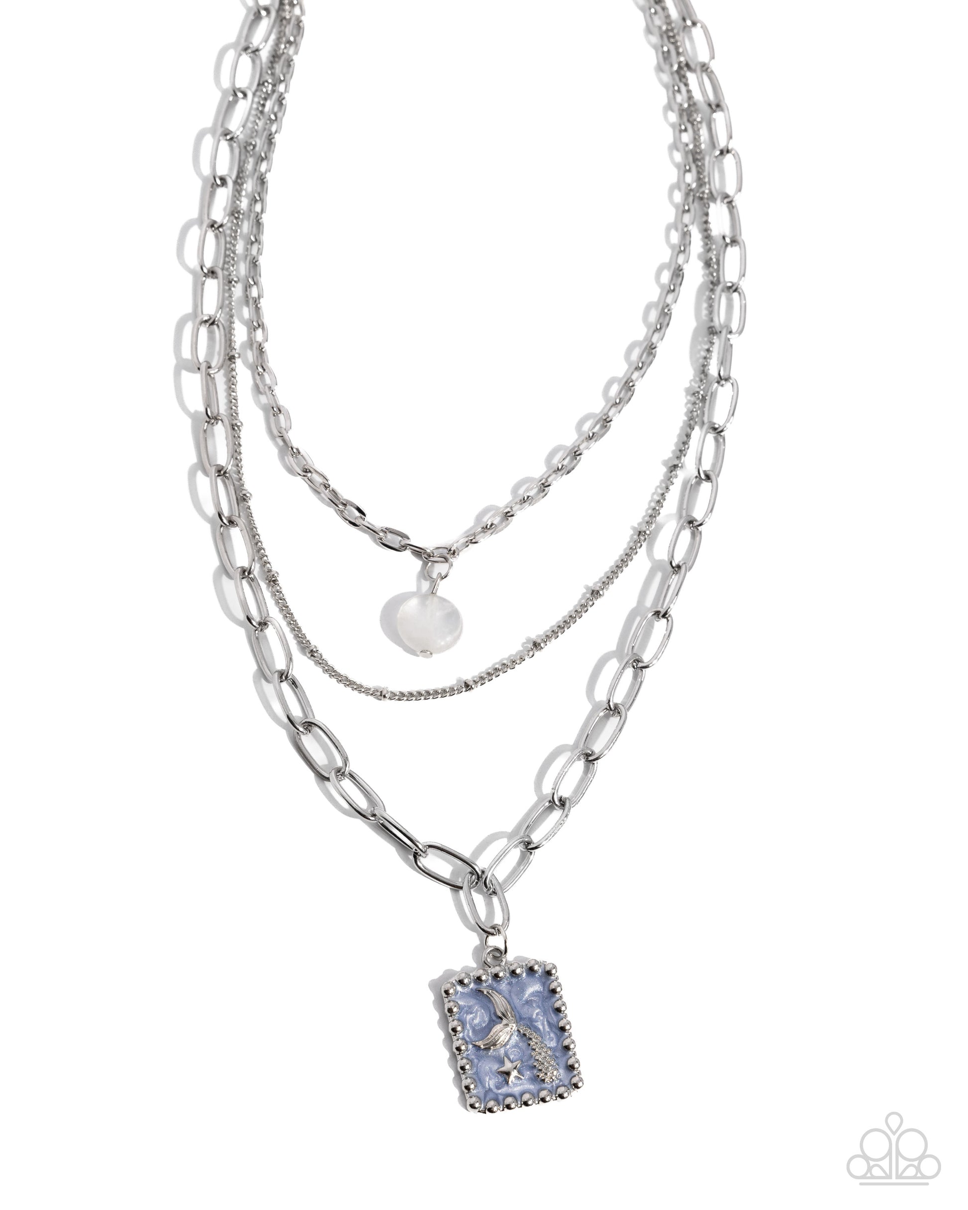 Three shimmery silver chains cascade below the chest, creating graceful layers. A round, clear white stone bead hangs from the uppermost chain while a raised, textured silver mermaid tail and solitaire silver star are featured in the center of a pearly Chambray Blue-painted, silver-studded pendant for a coastally chic look. Features an adjustable clasp closure. As the stone elements in this piece are natural, some color variation is normal.
