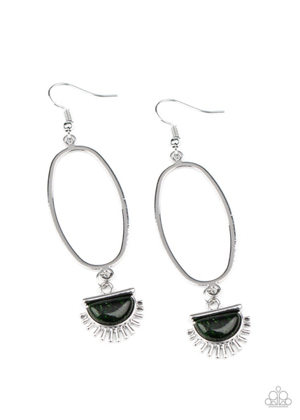A silver sunburst charm with a glittery green stone center dangles from the bottom of an elongated oval hoop for a trendy vibe. Earring attaches to a standard fishhook fitting.