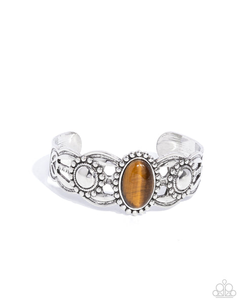 An oval Tiger's eye stone is pressed into the center of a studded silver frame atop an airy silver cuff embellished in studded sun-like frames for an earthy pop of seasonal color around the wrist.