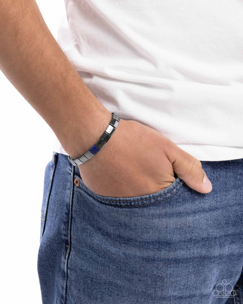Infused along elastic stretchy bands, a collection of squared lapis stones are sporadically dotted alongside sleek gunmetal square beads for an unrivaled urban display. As the stone elements in this piece are natural, some color variation is normal.
