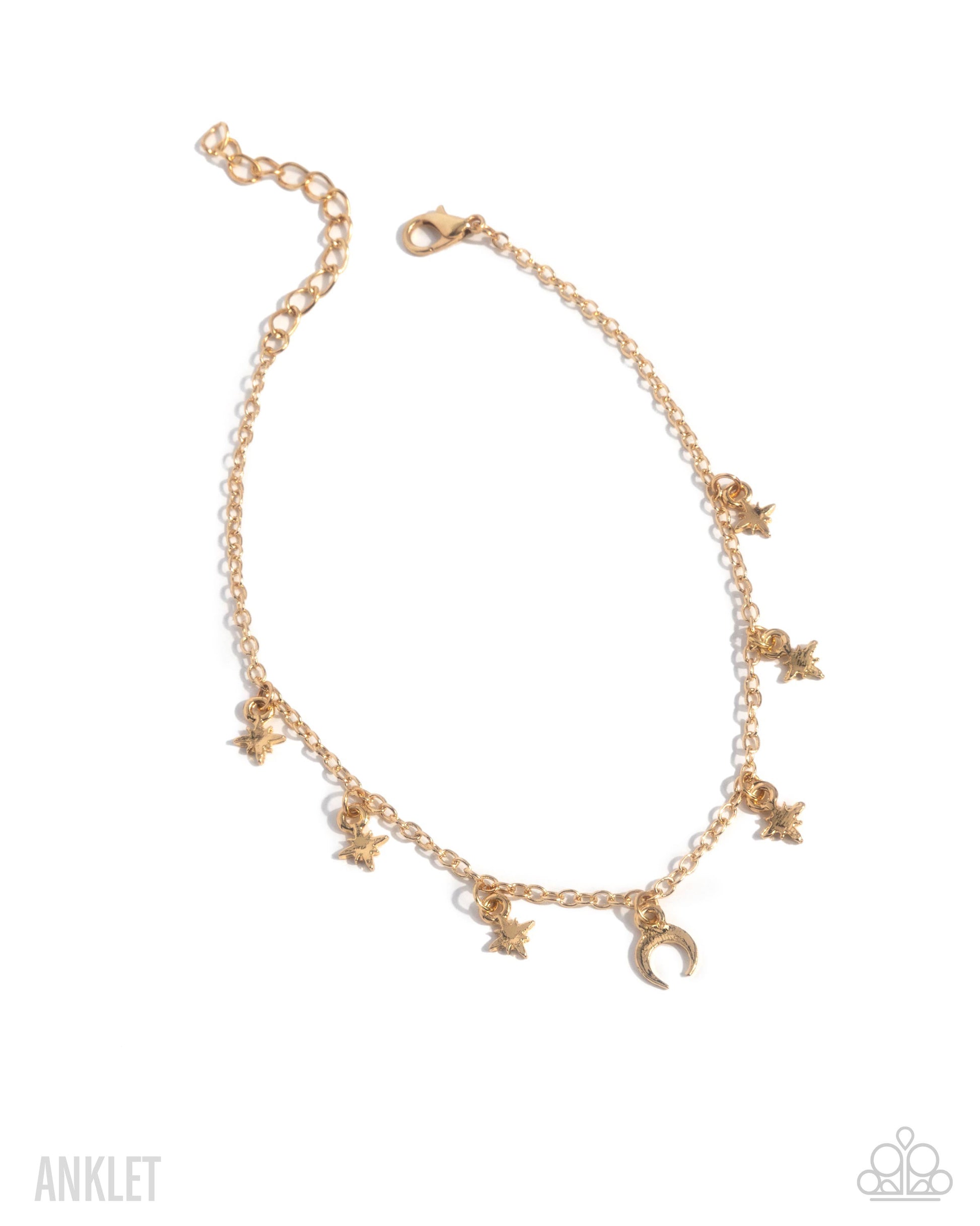 Swaying from a classic gold chain, a collection of dainty gold charms including three-dimensional stars and a tilted crescent moon coalesce around the ankle for a celestially chic display. Features an adjustable clasp closure.