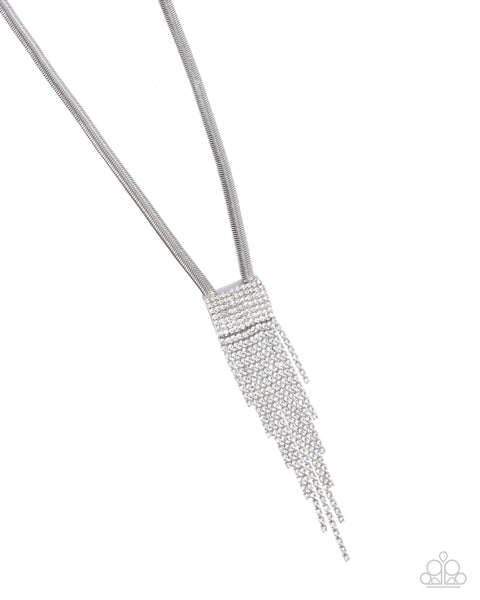 Embellished in row after row of glistening white rhinestones, a rectangular fitting glitters below the neckline giving way to strands of additional white rhinestones, creating a tapered fringe at the bottom of a sleek silver herringbone chain. Features an adjustable clasp closure.