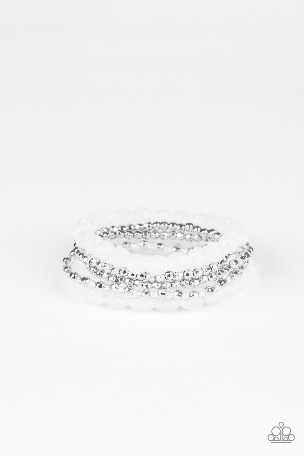 Varying in size and color, a collection of opaque white crystal-like beads and shiny silver accents are threaded along stretchy bands around the wrist, creating colorful layers.