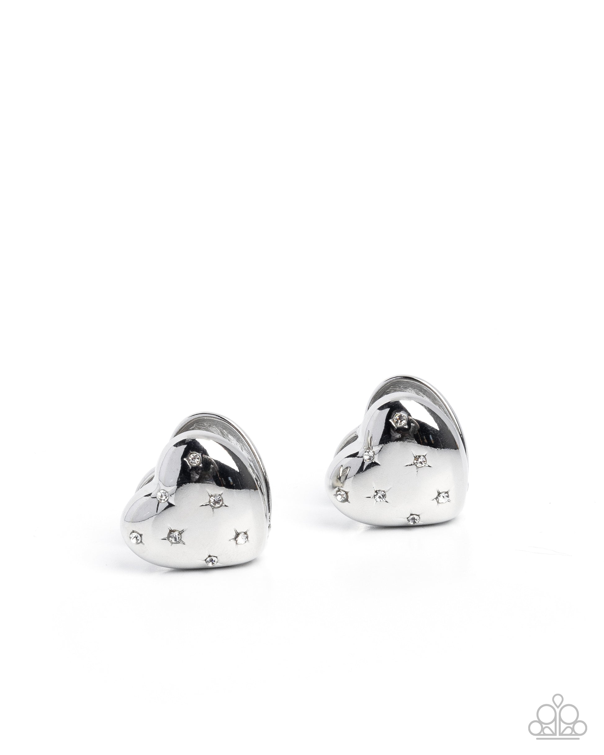 Dotted in dainty white rhinestone stars, a glistening silver heart opens around the ear for a cosmically cupid-inspired display. Earring attaches to a standard hinge closure fitting. Hoop measures approximately 3/4" in diameter.
