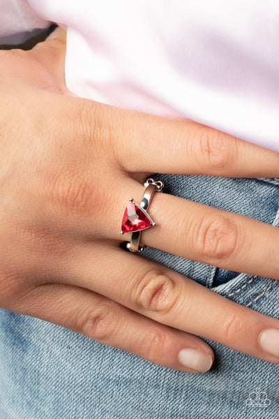 A fiery red triangular cut rhinestone is nestled inside of a pronged silver frame atop a classic silver band for a dash of dramatic dazzle. Features a stretchy band for a flexible fit.