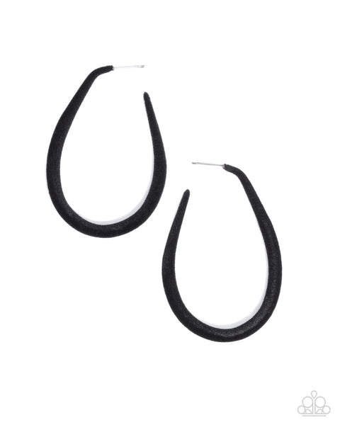 Encased in a playful felt, black teardrop hoops loop and curl below the ear for an endearing, equal display. Earring attaches to a standard post fitting. Hoop measures approximately 1 3/4" in diameter.