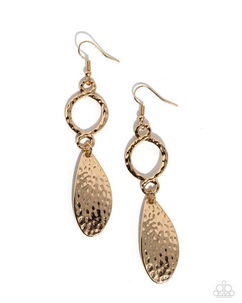 Hammered gold bars swoop into a chic hoop that links with a hammered gold oval plate, creating a refined lure. Earring attaches to a standard fishhook fitting.