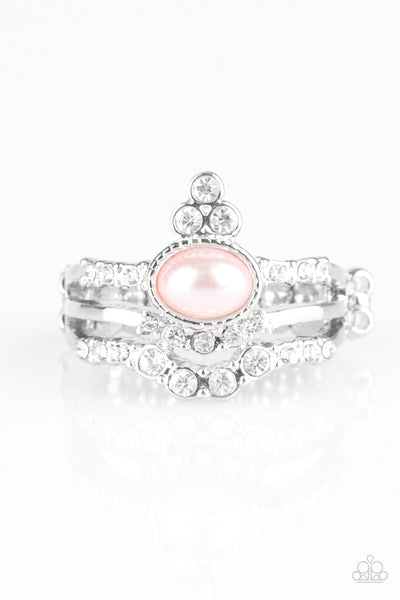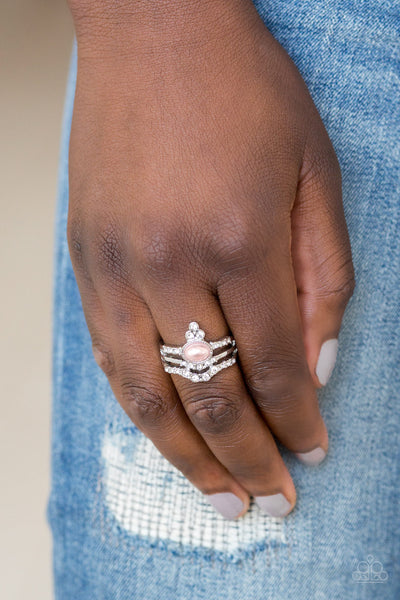 Encrusted in glassy white rhinestones, dainty silver bars arc across the finger, coalescing into an airy band. Dotted with a pearly pink bead, a glittery white rhinestone frame crowns the uppermost band for a regal finish. Features a stretchy band for a flexible fit.