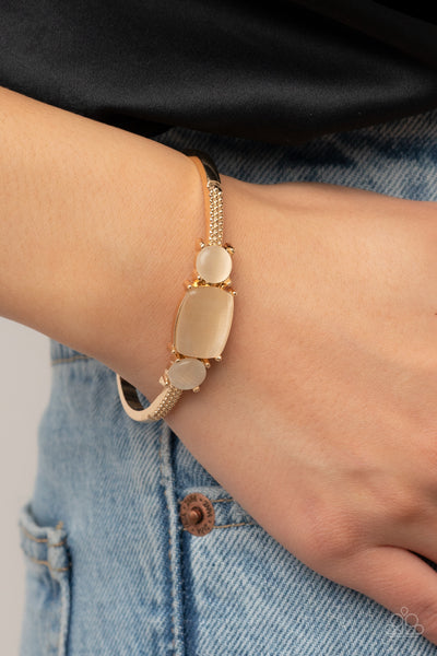 A rectangular golden cat's eye stone is flanked by a pair of golden cat's eye stones atop a textured gold cuff, resulting in a dainty pop of color atop the wrist.