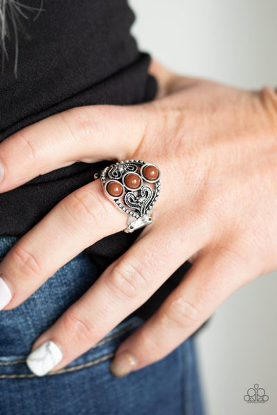 A collection of shimmery silver studs and heart-shaped filigree coalesces into a whimsical frame atop the finger. A trio of brown beads stack down the middle of the frame for a whimsical finish. Features a stretchy band for a flexible fit.