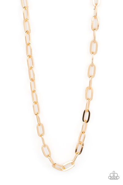 Featuring a high sheen finish, a shiny collection of oversized gold oval links boldly interlock across the chest for a grit-inspired look. Features an adjustable clasp closure.