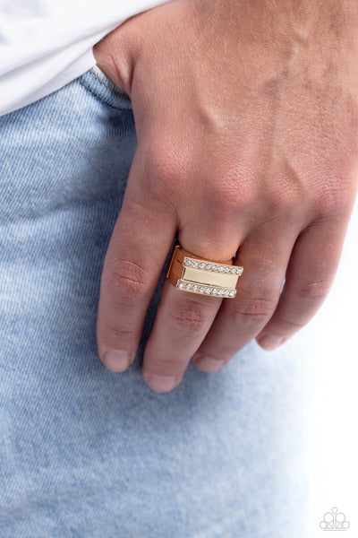 Two rows of white rhinestones are encrusted along the edges of a thick gold band for a statement look. Features a stretchy band for a flexible fit.