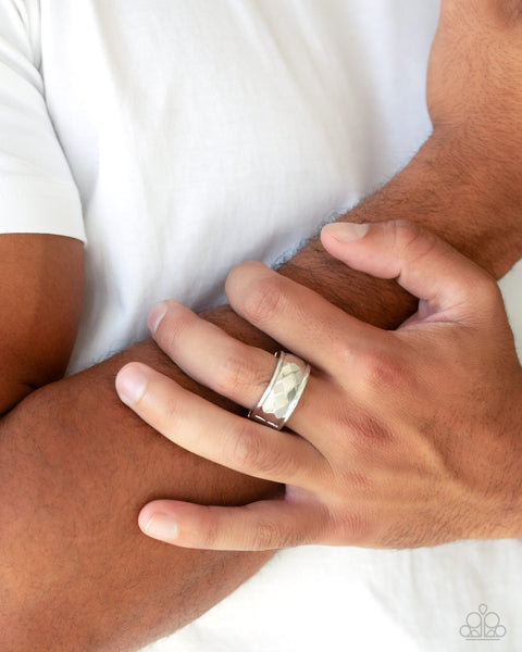 A faceted diamond-shaped pattern races across the center of a thick silver band for a tactile look. Features a stretchy band for a flexible fit.