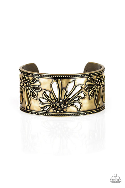 A hammered brass cuff is embossed and stenciled in an airy wildflower pattern for a seasonal look.