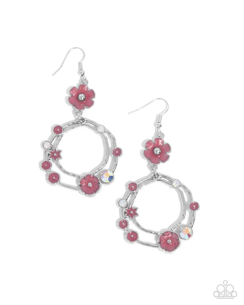 Etched in warped texture, a duo of silver rings, sporadically dotted with opalescent rhinestones, jelly-like Desert Rose flowers in varying sizes and dimensions, and a solitaire, larger iridescent rhinestone are threaded along a dainty silver jump ring, layering into a dizzying hoop. An additional jelly-like Desert Rose flower with a silver stud center sways above the dizzying hoop for a whimsical finish. Earring attaches to a standard fishhook fitting. Due to its prismatic palette, color may vary.