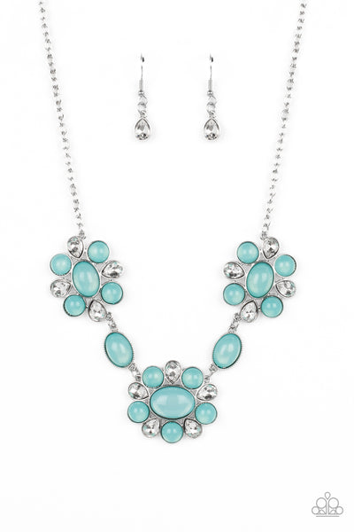 Brilliant, white, teardrop-shaped rhinestones, set in silver fittings, are set between glassy opalescent beads in the tranquil shade of Waterspout, wrapping around an oval bead in the same blue tint to create three floral-inspired clusters. Polished oval beads featuring the same dreamy opalescence are placed in between the clusters, segueing to the largest one that emerges as a fantastic focal point. Features an adjustable clasp closure.